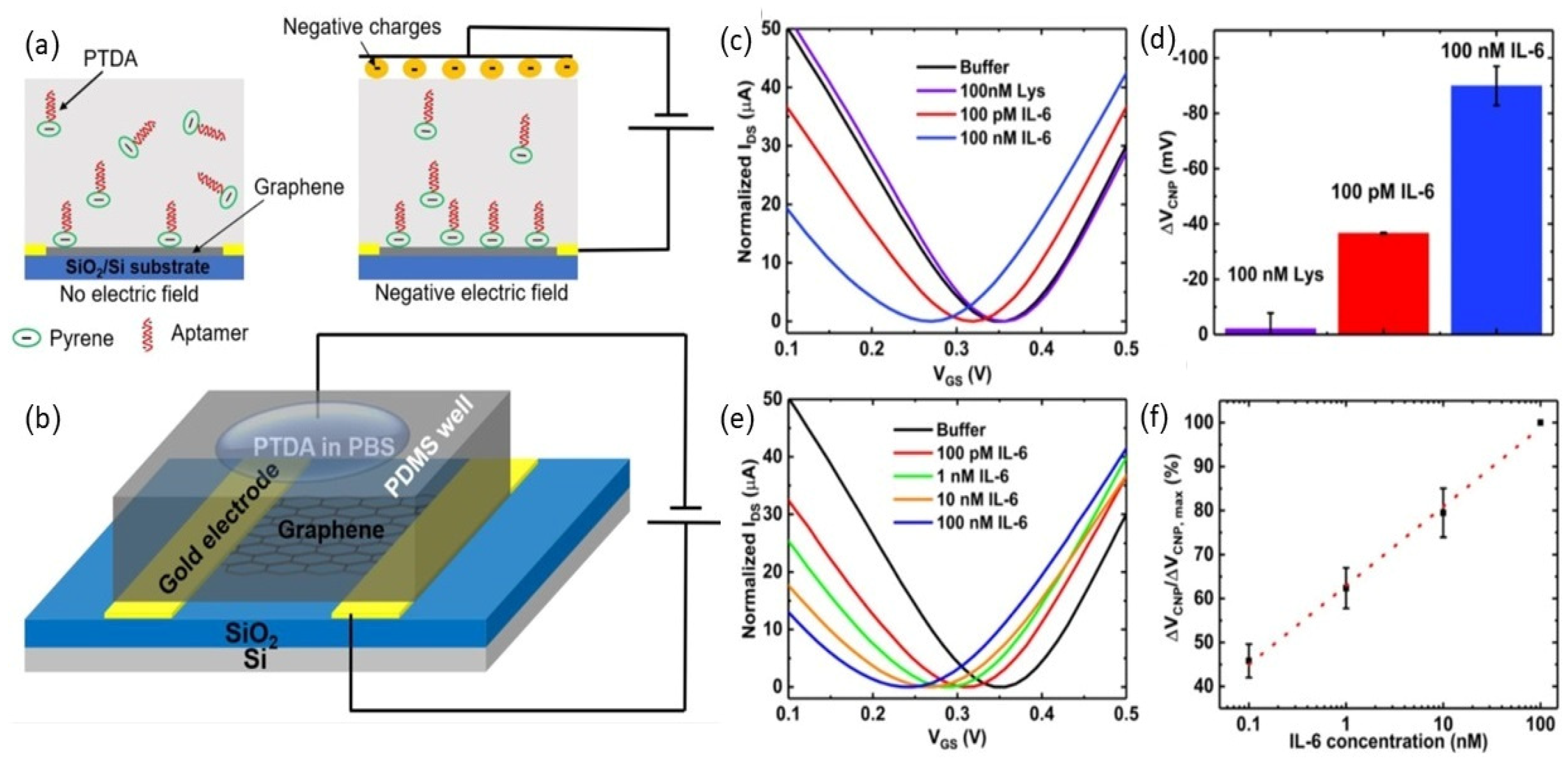 - Khan, N.I.; Song, E. Detection of an IL-6 biomarker using a GFET platform developed with a facile organic solvent-free aptamer immobilization approach. Sensors 2021, 21, 1335. [Google Scholar] [CrossRef]