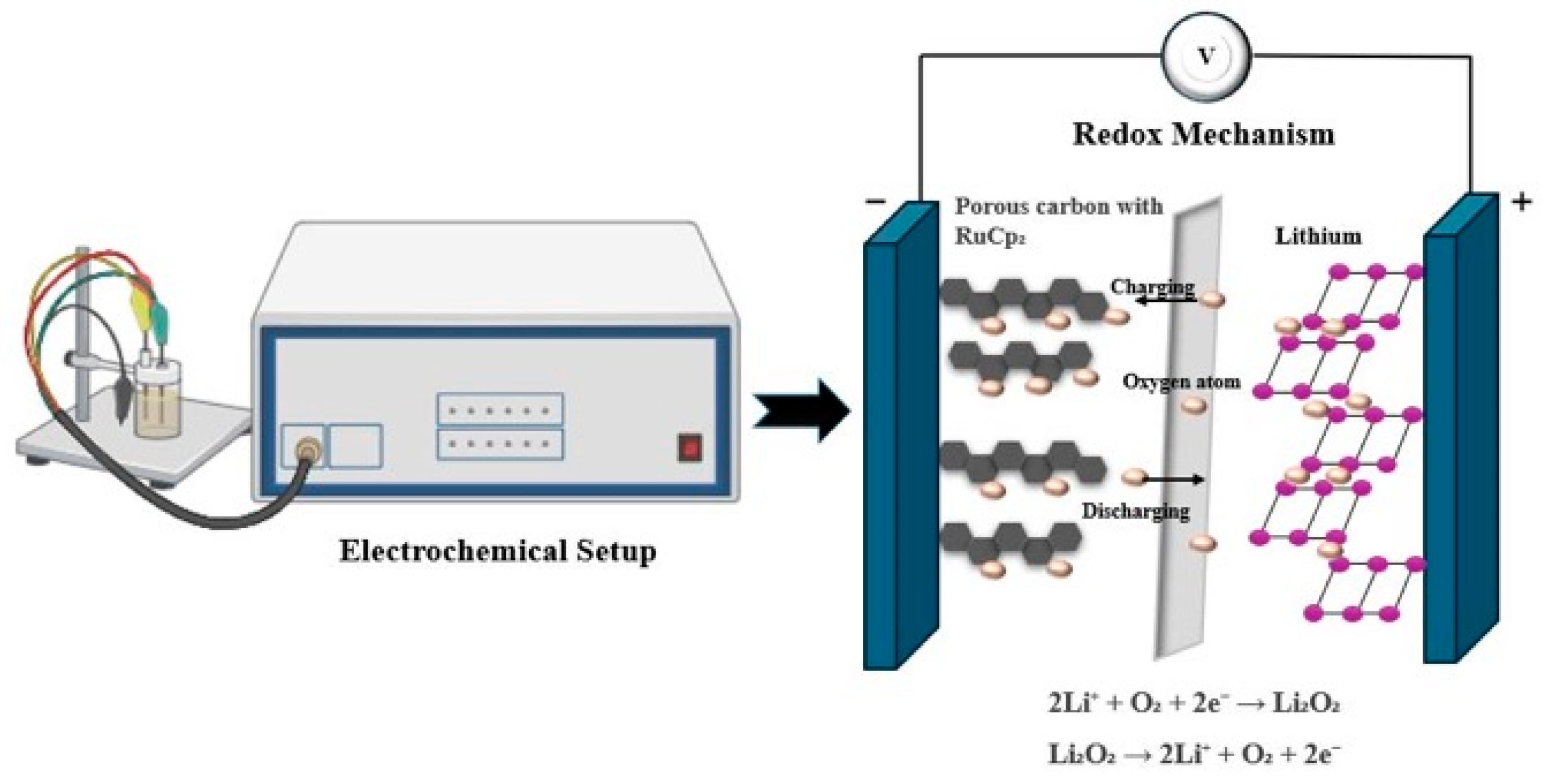 | [30] | Improved cyclic stability of Rc for lithium oxide batteries | Ketjen black cathode | 0.1 M Tetrabutylammonium perchlorate | CV and GCD |