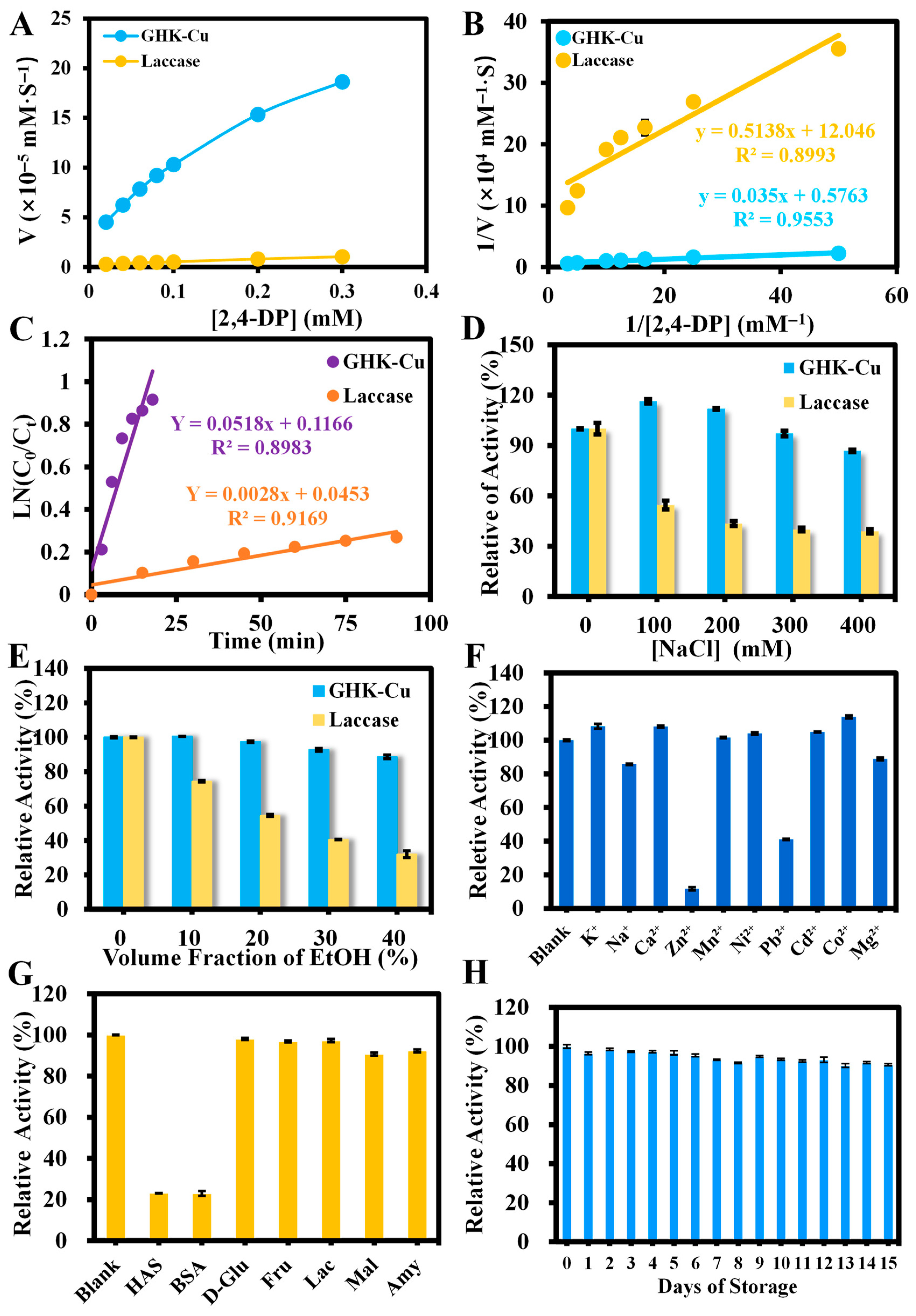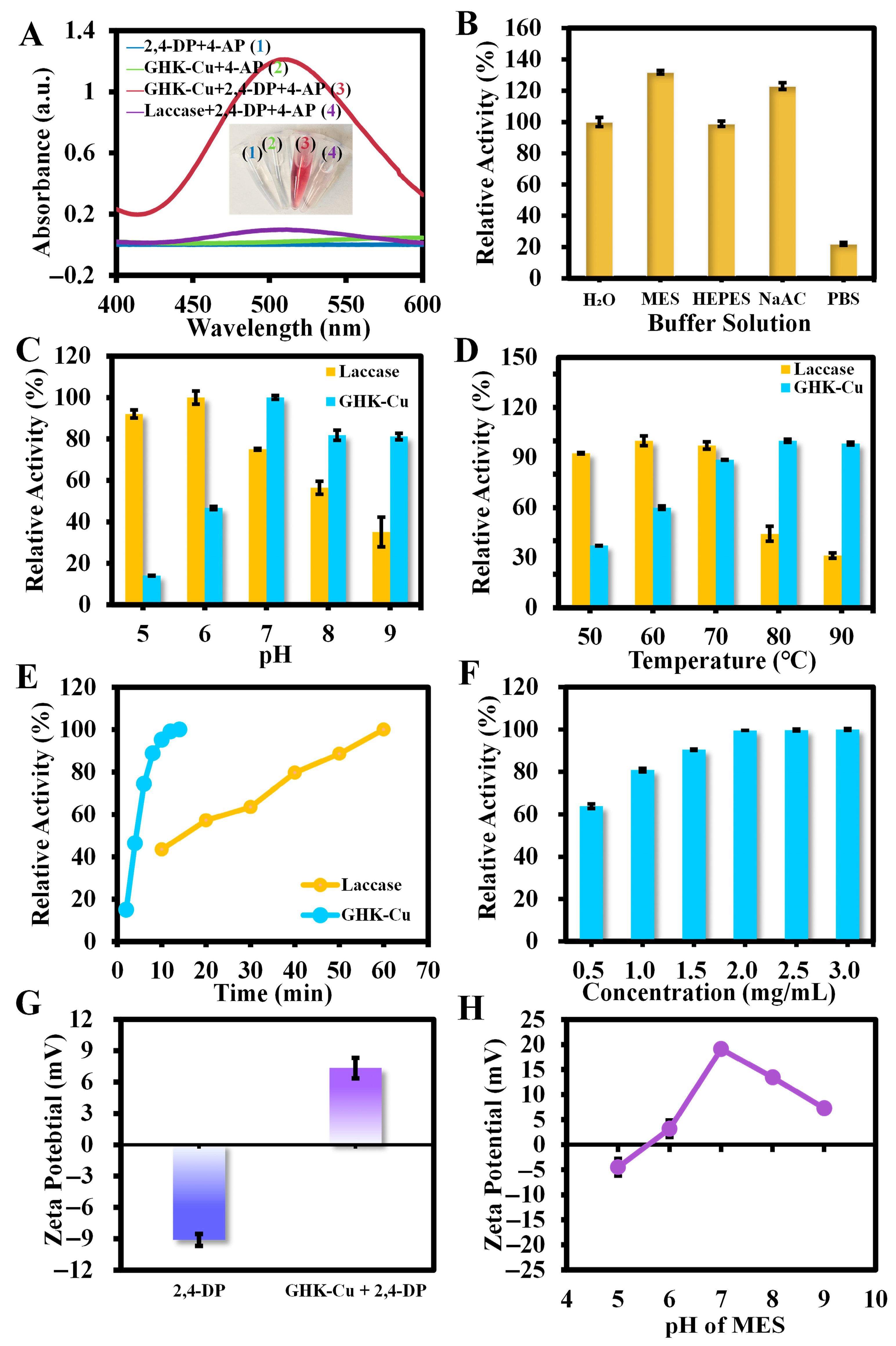 2.3. Exploration of the Laccase-like Activity of GHK-Cu and Laccase