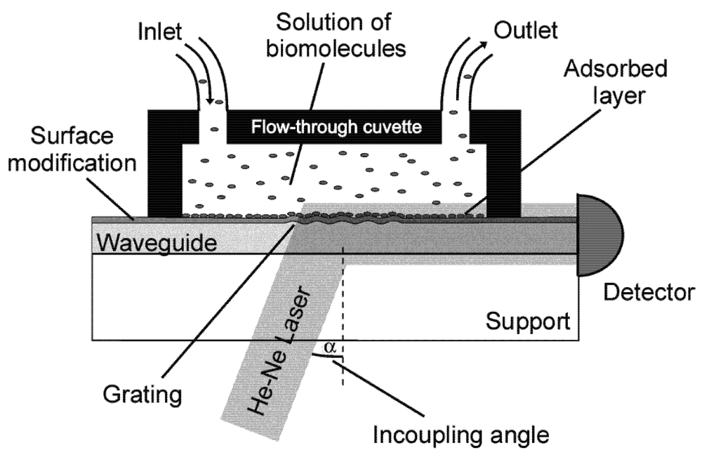 - Voros, J.; Ramsden, J.J.; Csucs, G.; Szendro, I.; de Paul, S.M.; Textor, M.; Spencer, N.D. Optical grating coupler biosensors. Biomaterials 2002, 23, 3699–3710. [Google Scholar] [CrossRef]
