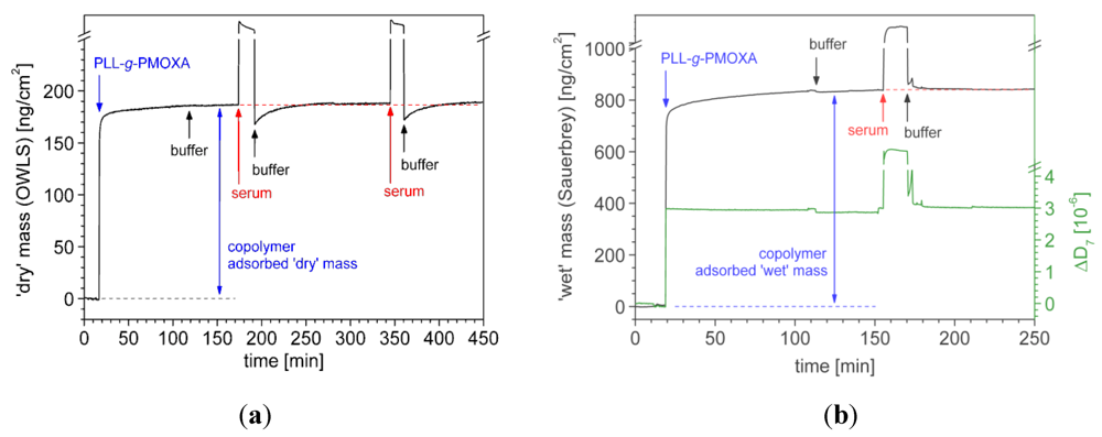 ) as obtained from OWLS measurements (see Figure 5(a)) and ‘wet’ mass of adsorbed copolymer (