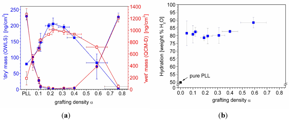 7.1. Case Study 1: Measuring Layer Thickness and Hydration by Complementary Evanescent Optical and Acoustic Techniques—A Case Study on PLL-g-PMOXA