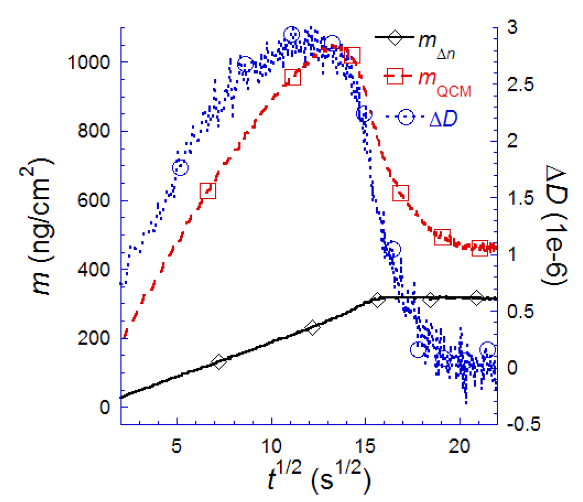 - Bailey, L.E.; Kambhampati, D.; Kanazawa, K.K.; Knoll, W.; Frank, C.W. Using surface plasmon resonance and the quartz crystal microbalance to monitor in situ the interfacial behavior of thin organic films. Langmuir 2002, 18, 479–489. [Google Scholar] [CrossRef]