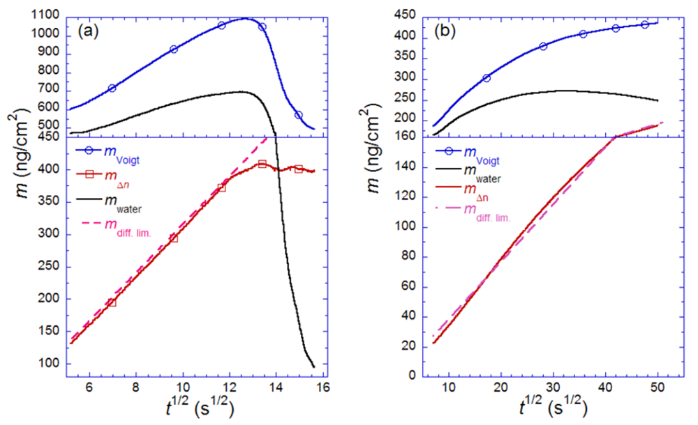 for (a) vesicle to bilayer formation; (b) streptavidin binding and 2D-crystallization on top of a biotinylated lipid bilayer. Shown is also the difference between the two measured masses, attributed to dynamically coupled water (mwater). The masses are calculated with the iterative method described in the text. Also shown in both plots are the expected adsorption rates for mass-transport limited adsorption (mdiff. lim.). Adapted with permission from Reimhult et al. [14]. Anal. Chem. 2004, 76, 7211–7220. Copyright 2004 American Chemical Society.