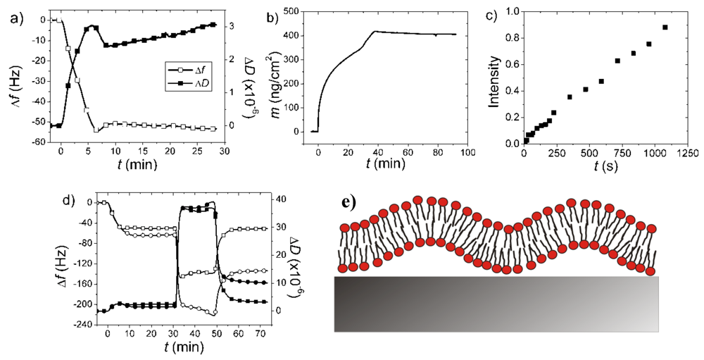 - Keller, C.A.; Kasemo, B. Surface specific kinetics of lipid vesicle adsorption measured with a quartz crystal microbalance. Biophys. J. 1998, 75, 1397–1402. [Google Scholar]