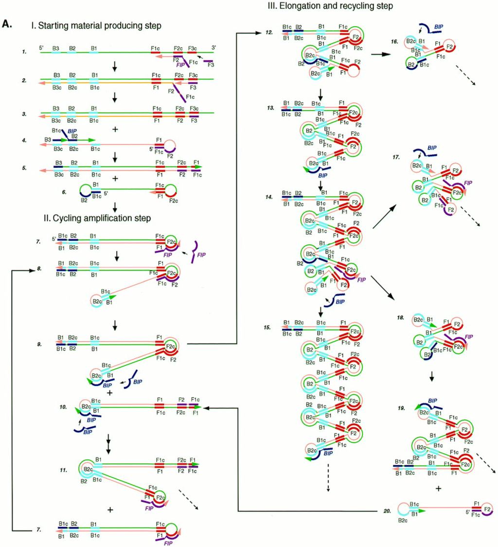 The subsequent cycles, comprising elongation and recycling steps, lead to final products constituted by a mixture of stem-loop DNAs having various stem lengths and cauliflower-like structures with multiple loops formed after the annealing between alternately inverted repeats of the target sequence in the same strand. It is to underline that only inner primers are used for strand displacement DNA synthesis during cycling reactions while all four primers are used during initial steps of the LAMP reaction. The initial use of four primers that enables the recognition of six distinct sequences, followed by the use of two primers, ensures the high selectivity for target amplification.