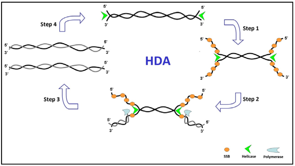 Progresses in understanding properties of helicases, discovered in Escherichia coli in 1976 [58,59], have enabled researchers to combine helicases with polymerases and other accessory proteins for applications in nucleic acid amplification. Helicase-dependent amplification (HDA) exploits the activity of a DNA helicase to separate complementary strands of double strand (ds) DNAs thus avoiding the temperature cycling to produce single-stranded templates for primer hybridization and subsequent primer extension by a DNA polymerase [60]. It mimics the denaturation mechanism in living organisms where DNA is replicated by DNA polymerases with the aid of DNA helicase to separate complementary DNA strands.