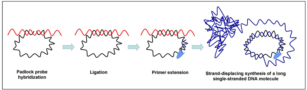 Efficient amplification by RCA requires small and circular single-stranded DNAs acting as the template. Unfortunately, a large number of relevant diagnostic DNA targets are composed of double stranded linear DNA molecules thus making it difficult the amplification process to be established. For this reason, oligonucleotides called padlock probes have been designed [81]. Padlock probes are oligonucleotides with the two lateral sequences complementary to two target sequences that are connected by a linker sequence. When the padlock probe hybridizes the target sequences it circularizes. Upon recognition of the target, the padlock segments are sealed through the action of a DNA ligase alone or in combination with a DNA polymerase [82]. As the circularizing step of a padlock probe is strictly target-dependent, high enough specificity is ensured to allow SNP analysis.