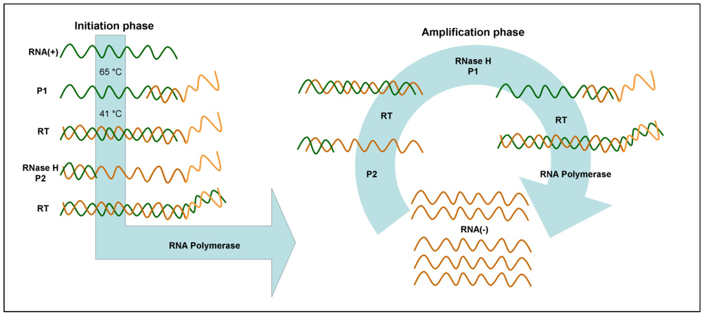 NASBA is an isothermal, transcription-based amplification method specifically designed for the amplification of single-stranded RNA or DNA sequence. It was first introduced by Compton in 1991 [107] and is performed at 41 °C. Thanks to the integration of the reverse transcription activity into the amplification process, the method is especially suited for RNAs such as mRNA, rRNA, tmRNA or genomic RNA [108]. However, NASBA cannot amplify double-stranded DNAs not subjected to a denaturation step [109].