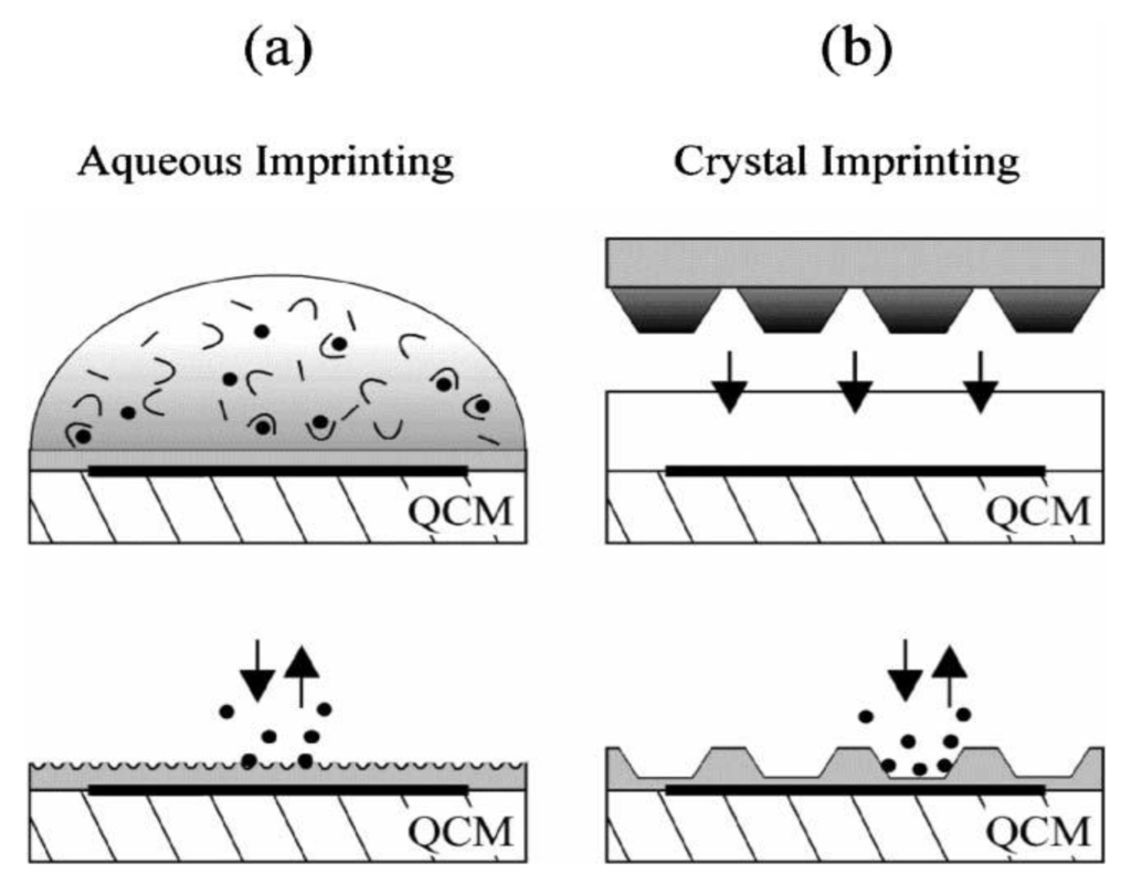 Surface-imprinting strategies on pre-coated QCMs. (a) Aqueous monomer solution containing the template is dripped onto the transducer surface for self-organizing receptor sites on the thin film surface. (b) A stamp with densely packed trypsin crystals is pressed into the pre-polymerized coating, templates are removed after polymerization. Reprinted with permission from [], © 2006 The Royal Society of Chemistry.