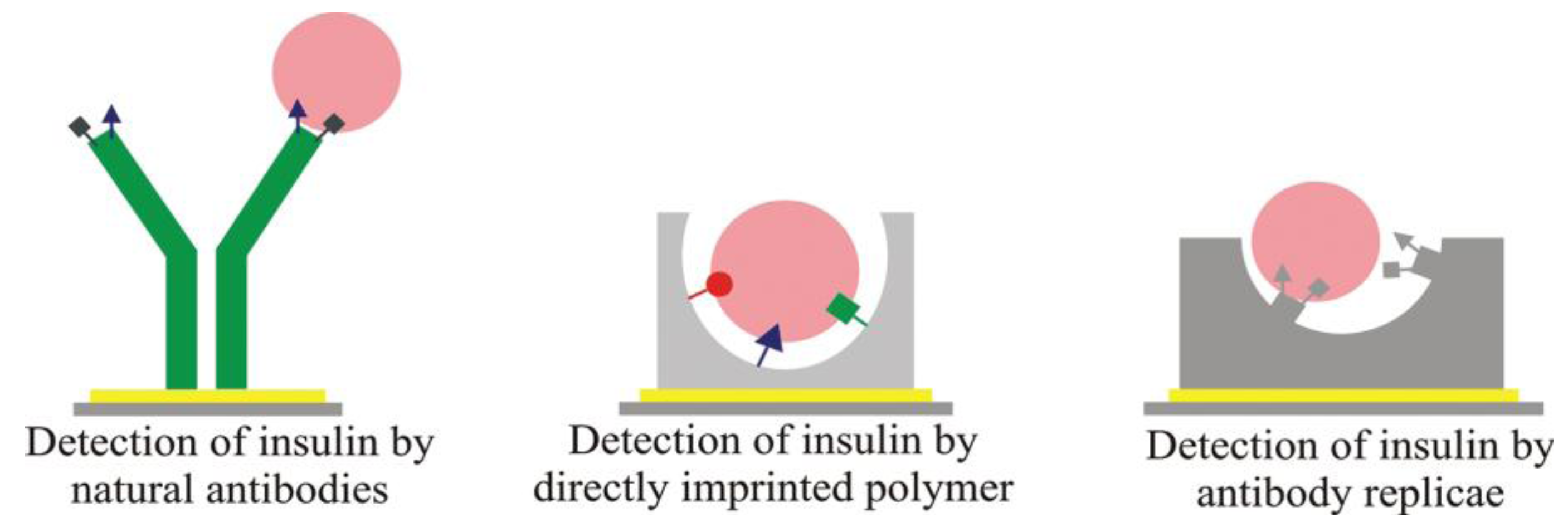 15] developed MIP layers to detect insulin. Additionally, they compared the binding properties of natural anti-insulin antibodies with the insulin surface MIP and achieved similar selectivity between insulin and glargin, but strongly increased sensitivity on the double MIP.
