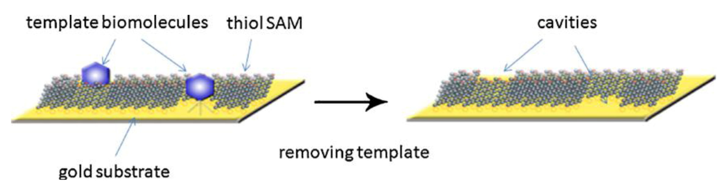 19] further developed the process and achieved detection of cancer biomarkers and other proteins by synthesizing surface-imprinted, self-assembled monolayers. For that purpose, the authors co-adsorbed hydroxyl-terminated alkane thiols and template biomolecules on gold-coated silicon chips, making use of the covalent bond between the thiol molecules and the gold surface leading to self-assembled monolayers. The biomolecules are removed from the surface which ultimately creates “footprint” cavities in the monolayer matrix. In