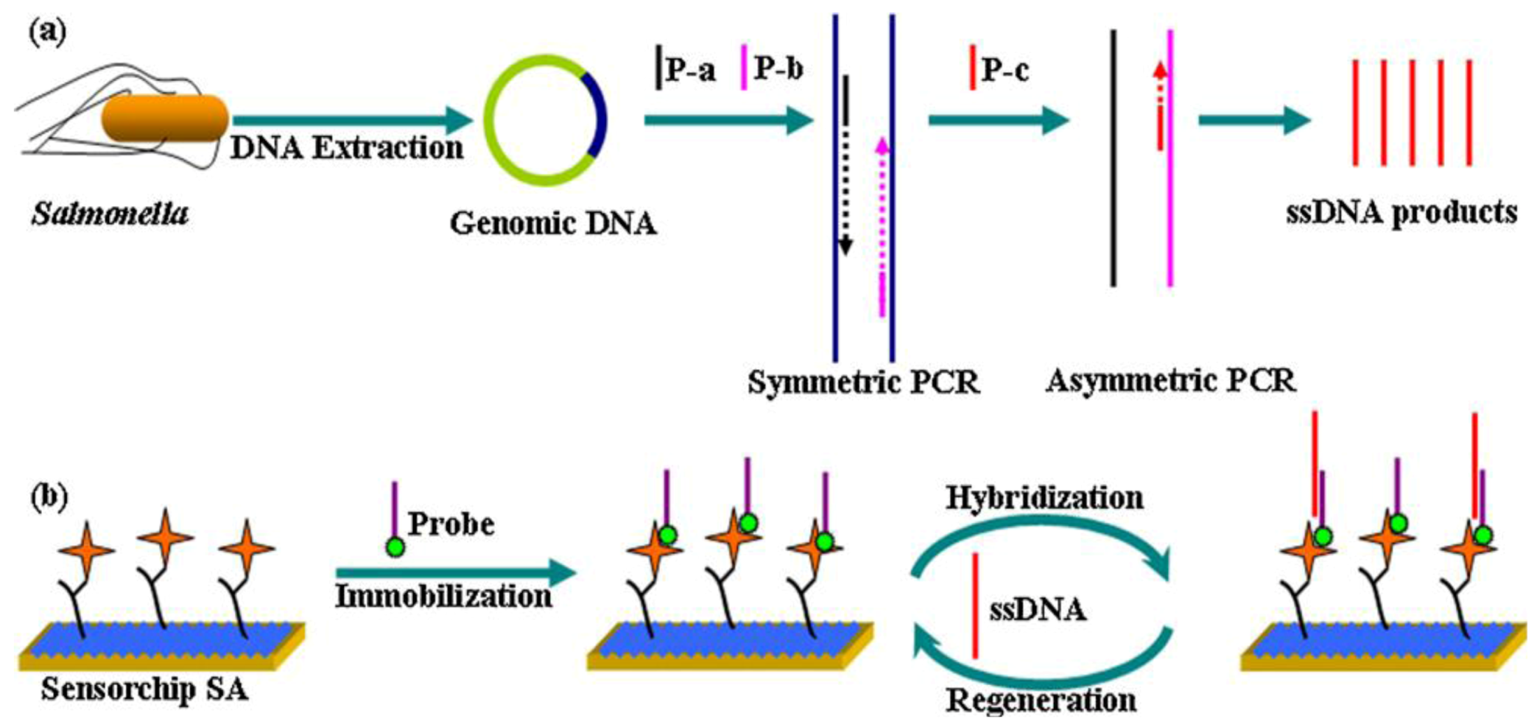 Salmonella-specific gene) of that species and immobilized it onto a streptavidin-coated dextran sensor surface. Employing surface plasmon resonance (SPR), detection limits of 0.5 nM were obtained with linearity from 5 to 1,000 nM.