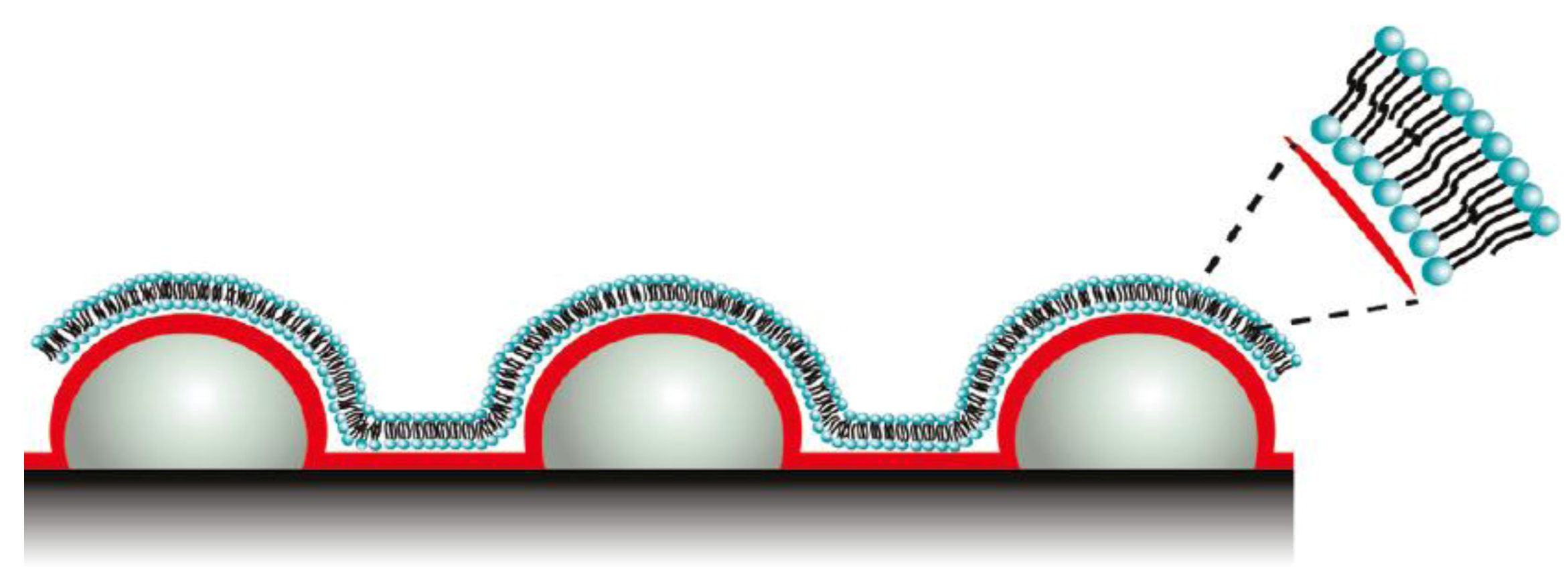 45] developed novel biomimetic membranes generated at nanostructured sensor substrates with controlled curvatures. Such template-supported lipid bilayers (SLBs) with controlled curvature allow for lipid sorting, phase separation, and protein binding. The SLBs were generated by vesicle adsorption followed by rupturing their structures. SLBs contain increased surface area due to underlying nanostructured surfaces with decreased radii of curvatures (ROC) confirmed by excess mass loading on QCM-D, and excess total fluorescence intensities.