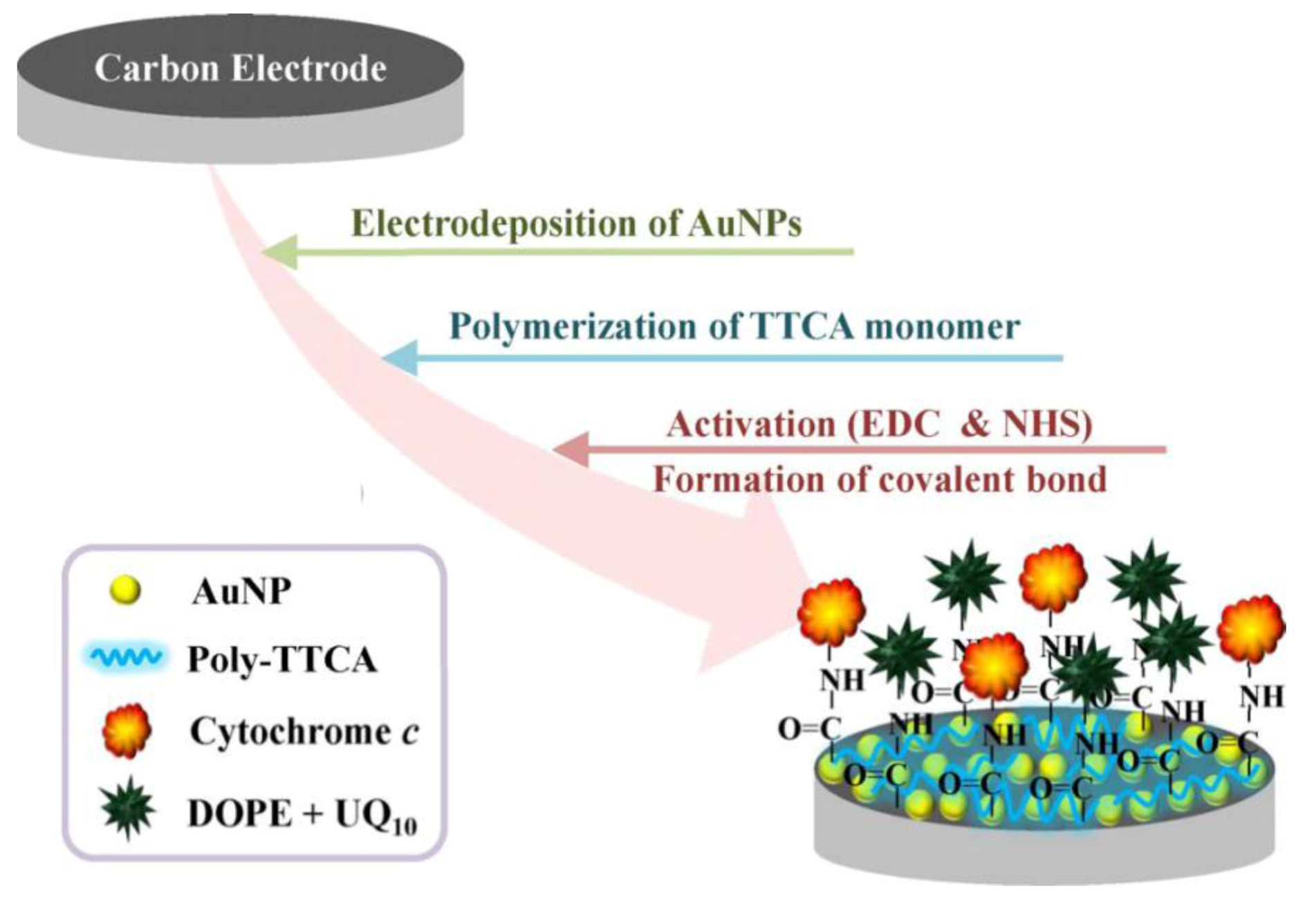 Figure 7, they modified a carbon electrode surface with gold nanoparticles (AuNPs) and electrodeposited a conjugated polymer (5,2′:5′,2′′-terthiophene-3′-carboxylic acid, TTCA), which acts as substrate for an artificial biomembrane. The specific bioaffinity properties were ensured by immobilizing ubiquinone (UQ
