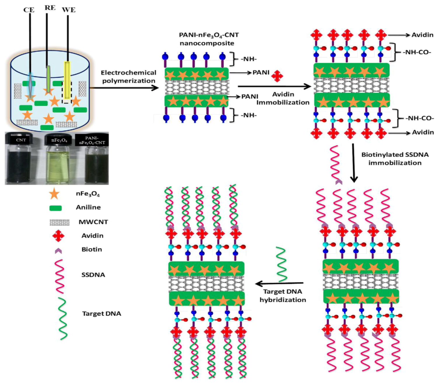 4-CNT nanocomposite and immobilization of biotinylated DNA using biotin-avidin coupling followed by hybridization for bacterial detection. Reprinted with permission from [