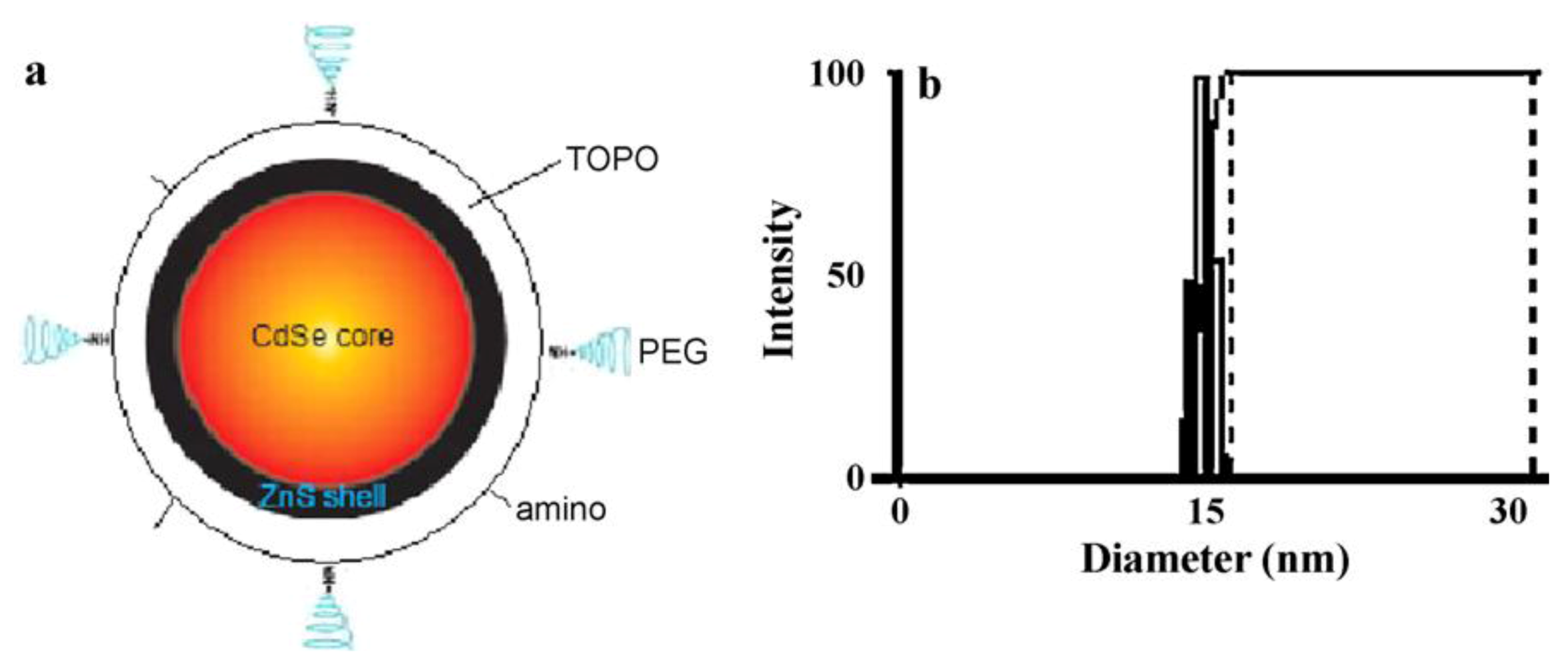 b) in the aqueous environment of living cells. The averaged diameter of the QD is 15.0 ± 0.8 nm. Reprinted with permission from [
