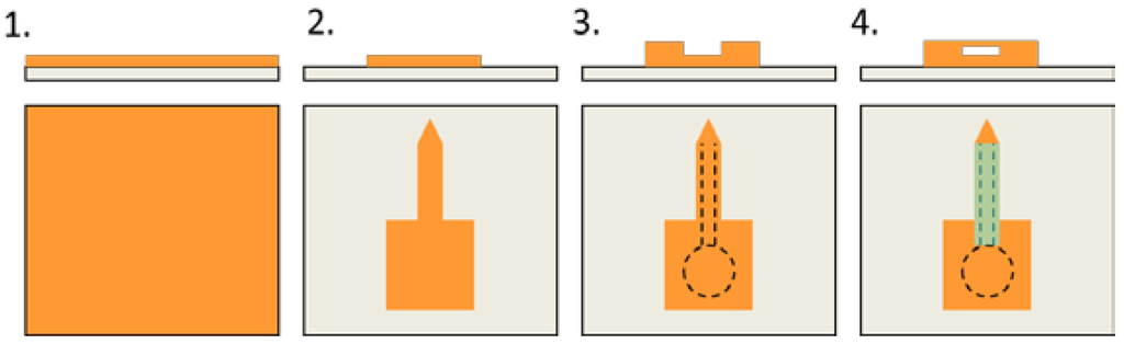 Schematic of the process flow for SU-8 SPT fabrication: (1) Spin on SU-8 layer; (2) expose device base; (3) spin on second SU-8 layer and expose sidewalls; (4) optional short exposure to form a membrane over the channel.