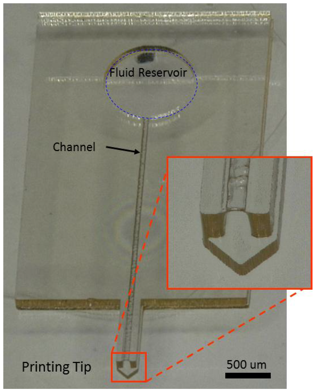 The printing channels of the standard “quill pen” surface patterning tools (SPTs) used with the Bioforce Nano eNablerTM (NeN) are too narrow (approx. 5–40 µm in width) to accommodate the printing of mammalian cells (approximately 10 µm in diameter and larger), leading to the development of new SPTs with larger printing channels to permit cell passage. Polymeric SPTs were fabricated out of SU-8 negative photoresist using standard lithographic techniques and as described previously [,] and shown schematically in Figure 1. In short, the first SU-8 layer was spun onto a silicon wafer and exposed via photolithography to form the basal layer of the SPT, followed by a second resist layer that is exposed to form the reservoir and channel walls of the printing cantilever. Finally the SU-8 SPTs were released from the wafer during the SU-8 development. A micrograph of a completed SU-8 SPT is shown in Figure 2.