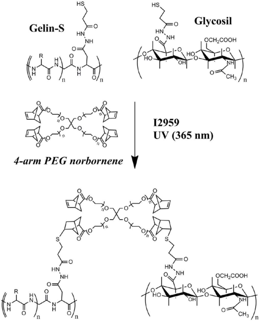 Radically-mediated thiol-ene photopolymerization using thiolated hyaluronic acid, porcine gelatin, 4-arm PEG norbornene, and Irgacure 2959 (I2959).