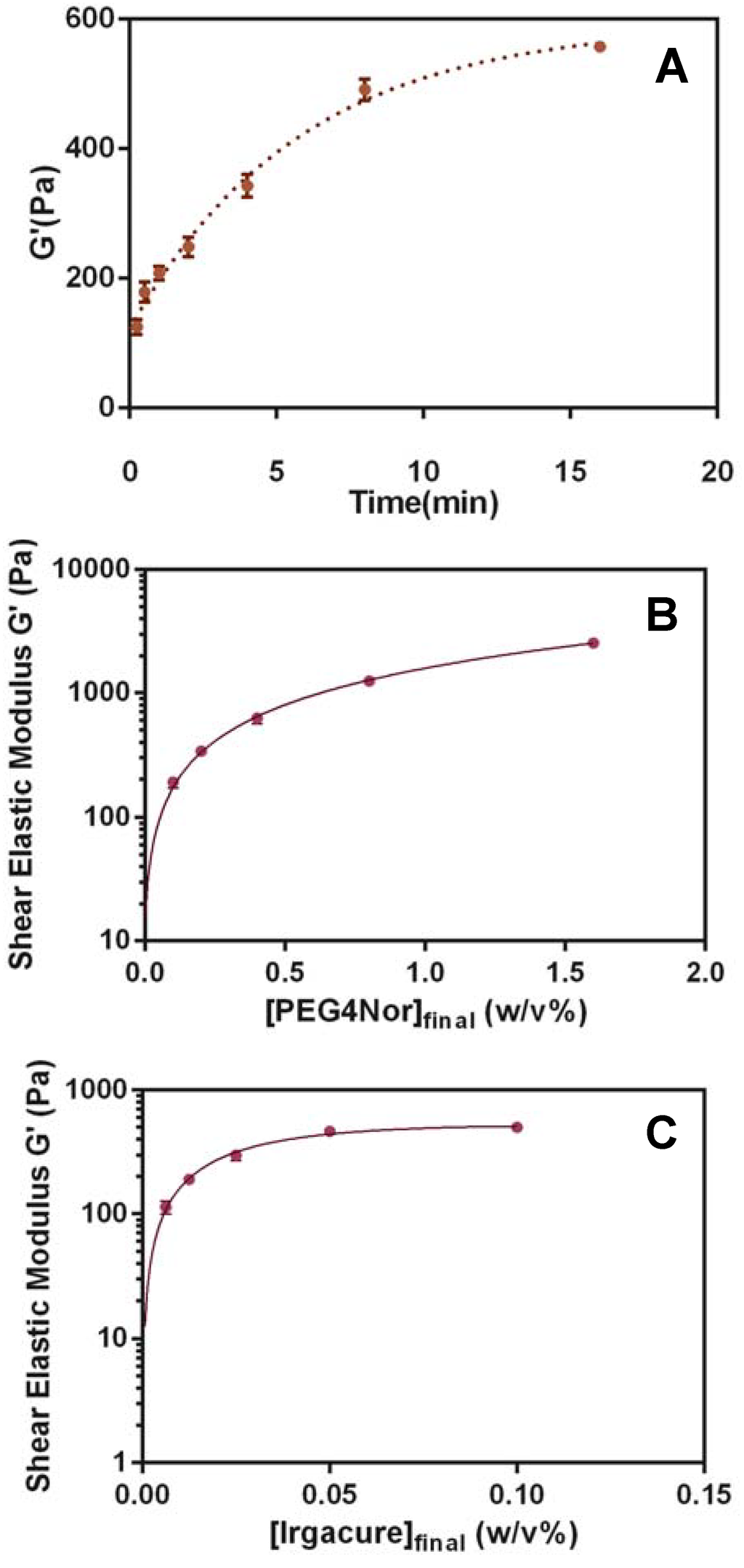 Rheometry experiments for shear elastic modulus (G′) of hydrogel networks formed with Glycosil, Gelin-S, at different ultraviolet light exposure times and substrate concentrations. (A) Time course with final concentration 0.2% w/v PEG norbornene and UV illumination for up to 15 min. (B) PEG norbornene dose response (final concentrations listed) with UV illumination for 3 minutes at each concentration. (C) Irgacure 2959 dose response with hydrogels prepared with PEG norbornene (0.2% final concentration) and UV illuminated for 3 min at each concentration.