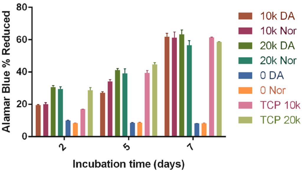 Alamar Blue percent reduction for ADSCs on HyStem-C crosslinked with either PEGDA (Extralink) or PEG norbornene and grown in 2D. The figure legend nomenclature shows number of cells/well (0; 10 K, 10,000; 20 K, 20,000) followed by type of crosslinker (DA, Extralink; Nor, PEG norbornene). TCP indicates tissue culture plastic controls at different cell numbers.