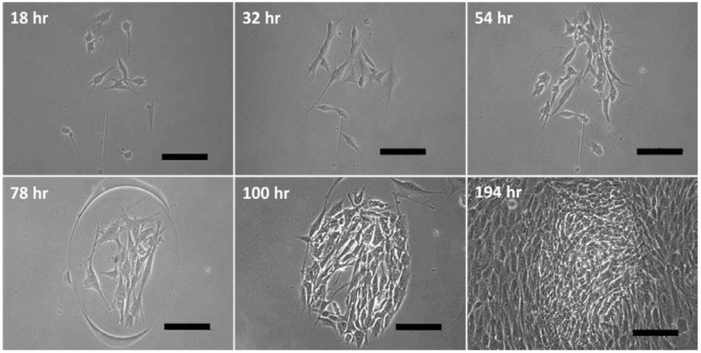 Demonstration of NIH/3T3 cell growth within printed spots over 8 days, images at hour 18, 32, and 54 show the consistent progression of the same spot. Scale bar = 100 μm.