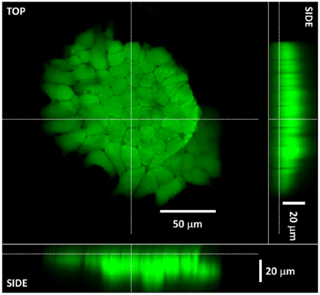 To assess the 3D nature of printed spots of cells in HyStem-C/PEG norbornene, and further assess biocompatibility with other cell lines, we printed mouse embryonic stem cells (mESCs). Patterned mESCs were subjected to live/dead staining. After staining, confocal laser scanning microscopy was used to reveal the cell positions within the printed matrix material by producing an optical cross-section of the deposition from the complied image planes (Figure 7). Examination of the deposition cross-section confirms that the cells growing within the matrix reach a height of approximately 20–25 µm from the glass surface. Like many eukaryotic cells, the average mESC cell possesses a diameter of roughly 10 µm, suggesting that the growth within the microenvironment of the printed matrix is two to three cell layers in height, which is indicative of 3D cell growth. Additionally, none of the cells within the examined deposition were positive for ethidium homodimer-1 (which stains the nucleus red for dead cells), demonstrating that high survivability of mESCs was maintained when submitted to our patterning process.