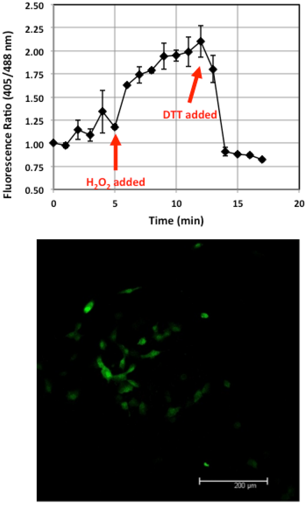 Top: Living biosensor function is verified by plotting the ratio of 405 nm fluorescence intensity (oxidized) over the 488 nm intensity (reduced). Bottom: Fluorescence micrograph of a representative printed spot of MHS-roGFP-R12 cells (scale 200 µm).