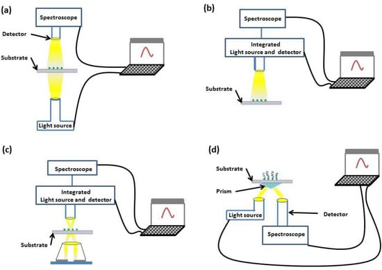 The optical geometries that are employed within LSPR sensors are transmission [34], reflection [35], dark-field scattering [36] and total internal reflection (TIR) [37]. These optical geometries are illustrated in Figure 3.