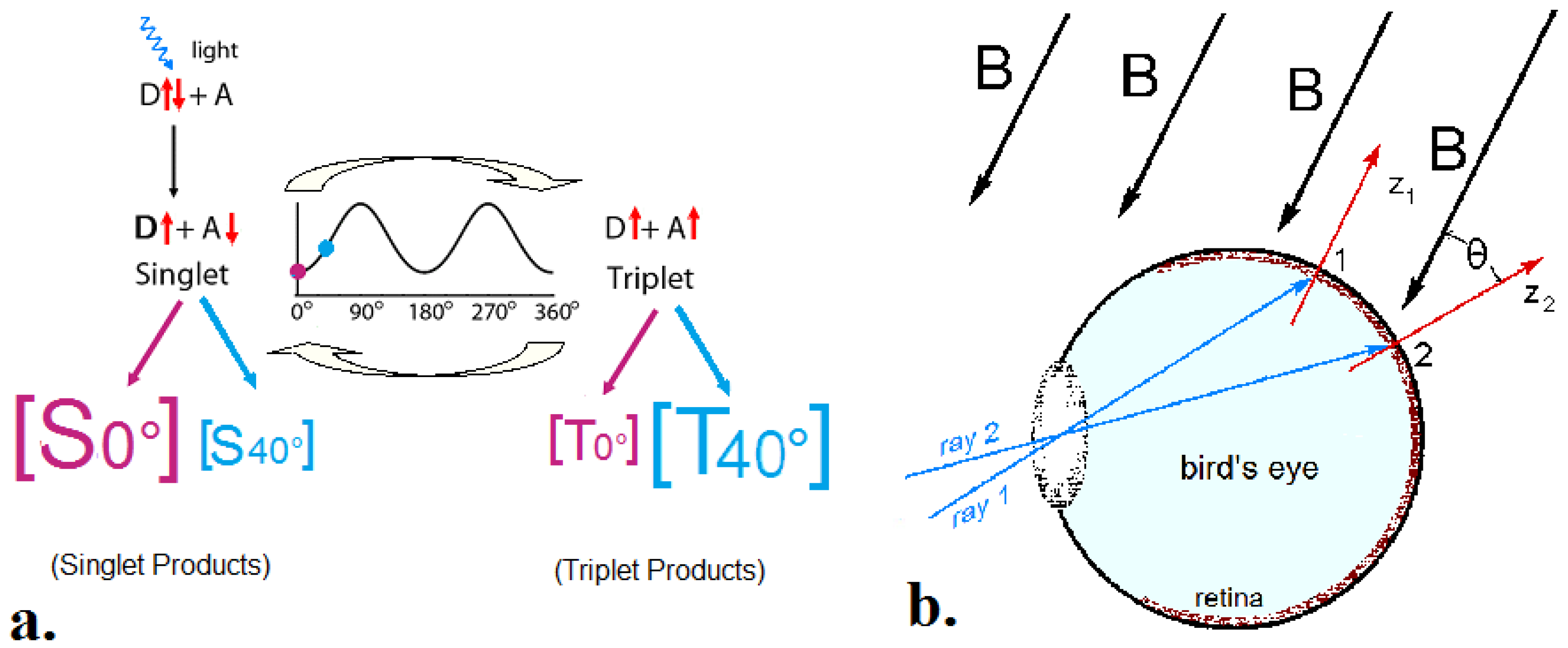 - Ritz, T.; Ahmad., M.; Mouritsen, H.; Wiltschko, R.; Wiltschko, W. Photoreceptor-based magnetoreception: Optimal design of receptor molecules, cells, and neural processing. J. R. Soc. Interface 2010, 7 (Suppl. 2), S135–S146. [Google Scholar] [CrossRef]
