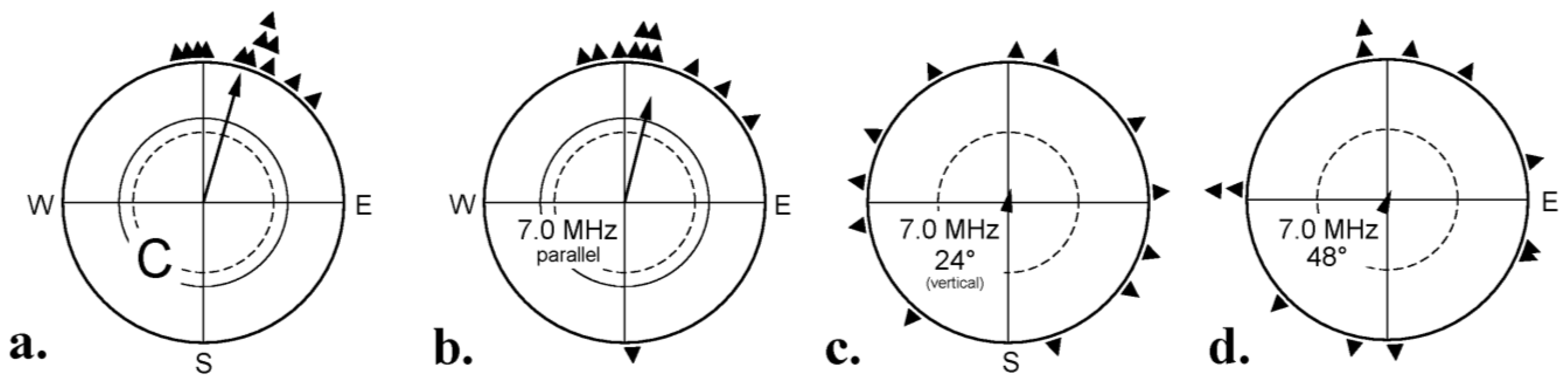 - Wiltschko, W. Further analysis of the magnetic compass of migratory birds. In Animal Migration, Navigation, and Homing; Schmidt-Koenig, K., Keeton, W.T., Eds.; Springer Verlag: Berlin/Heidelberg, Germany, 1978; pp. 302–310. [Google Scholar]