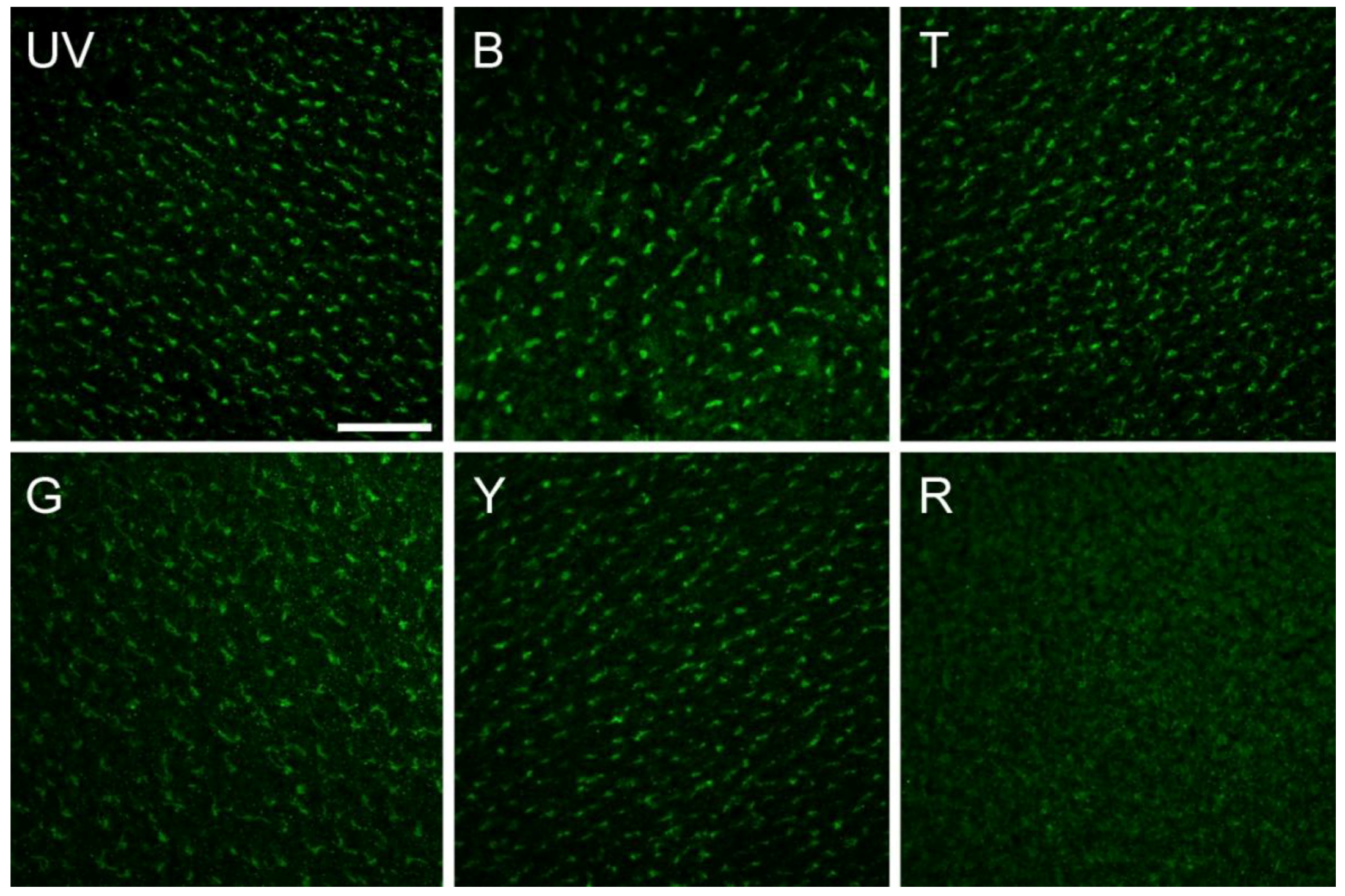 - Das, D.; Wilkie, S.E.; Hunt, D.M.; Bowmaker, J.K. Visual pigments and oil droplets in the retina of a passerine birds, the canary Serinus canaria: Microspectrophotometry and opsin sequences. Vis. Res. 1999, 39, 2801–2815. [Google Scholar] [CrossRef]