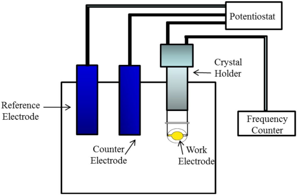 Schematic electrochemical quartz crystal microbalance (EQCM) apparatus.