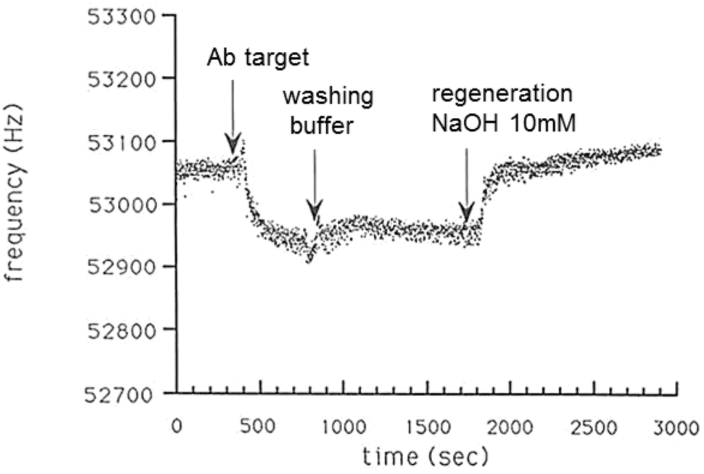 The first piezoelectric immunosensor was developed by Shons et al. [50]. The crystal was precoated with nyebar C and BSA and was used to detect BSA antibodies. The main drawbacks associated with these sensors are a lack of reproducibility in antibody immobilization on the crystal surface and the viscous drag experience in the liquid phase. In order to overcome the latter problem, the resonance frequency of the crystal can be determined in air prior to the addition of sample. The crystal may then be dried, and any change in resonant frequency due to biospecific binding can be calculated. This is known as the ‘dip and dry’ method [51,52].