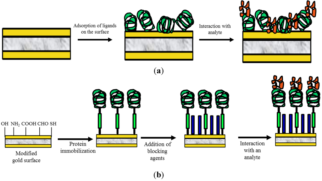 (a) Adsorption immobilization scheme. (b) General route for covalent immobilization of bioreceptors.