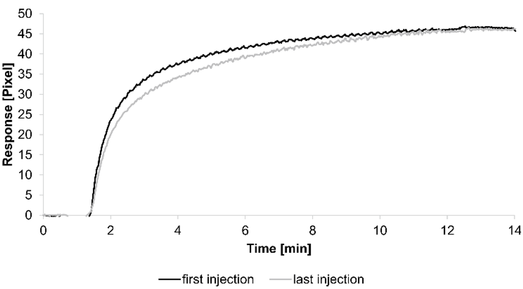 The curves obtained from both injections were quite similar, demonstrating the reliability of the assay. Additionally, each tested concentration was analyzed using two sensing and two reference spots.