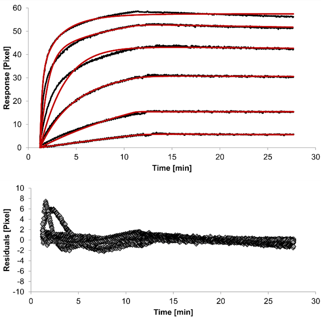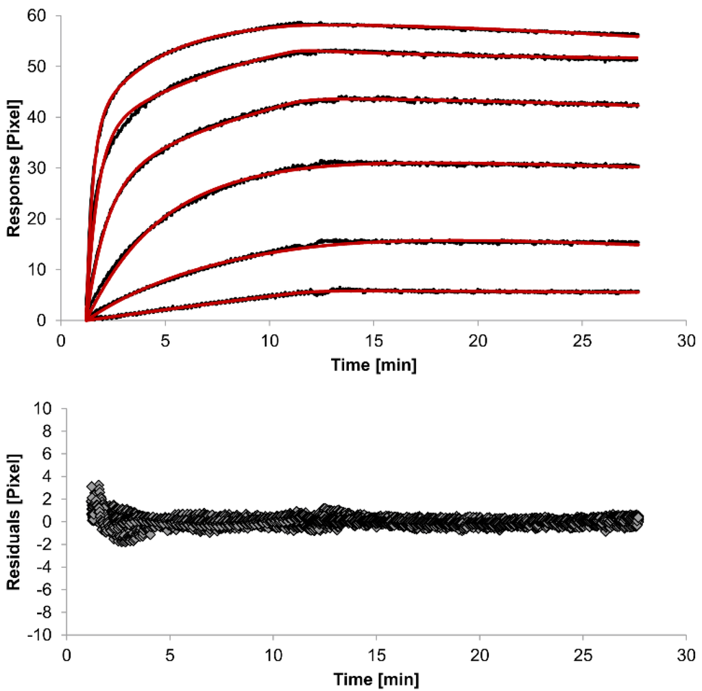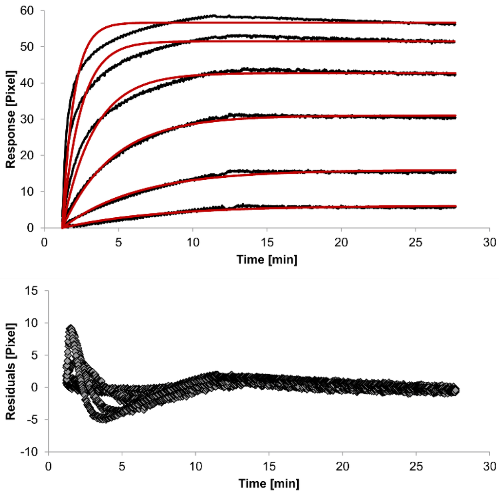 Another way to measure goodness of fit is the Chi-squared (χ2) value, which reflects the differences between measured and expected (modelled) values (the smaller the value, the better the fit). Since the χ2 value depends on signal intensity, the values for the different immobilization levels should not be compared to each other. Nevertheless, the values of the χ2 are shown in Table 1.