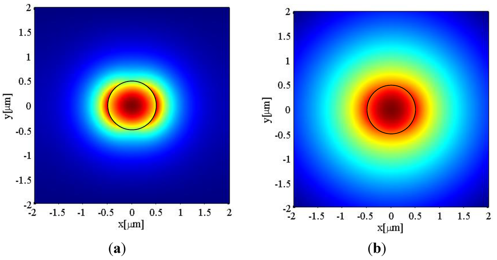 As an example of the use of the analysis above, the electric field components of the HE11 mode at the wavelength λ = 1550 nm are calculated using a commercial software—Comsol. The electric field intensity E2, defined as Er2 + Eθ2 + Ez2, of a 1 µm diameter microfibre with an air cladding (RI ≈ 1) is shown below in Figure 2a. One can see that a portion of the light is guided as the evanescent field outside of the microfibre with a power discontinuity at the fibre surface. This evanescent field fades away within a distance of circa 1 μm from the microfibre surface. A second example important for many sensing applications concerns the case when microfibres operate in an aqueous environment. The electric field intensity for the same microfibre with water cladding (RI = 1.33) is shown in Figure 2b. In comparison with the air-clad microfibre, the smaller index difference between water and silica results in a weaker confinement of the guided modes in the silica microfibre. Also Figure 2b shows that the electric field expands further outside the microfibre with a longer tail.