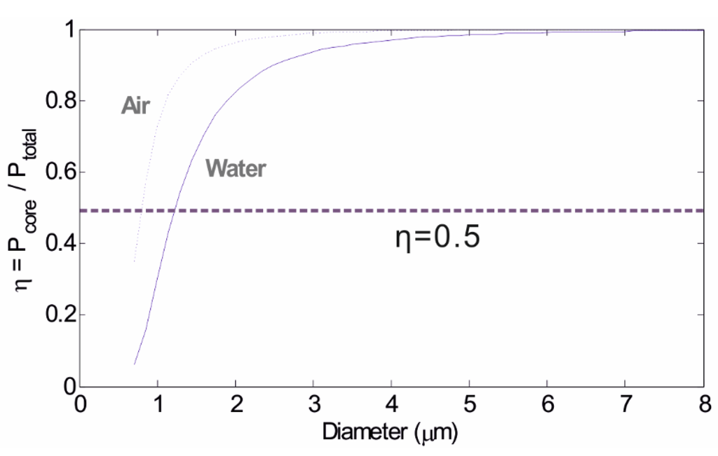 Figure 3 shows the change of η with the microfibre diameter for both air-clad and water-clad conditions. A low value of η corresponds to a large evanescent field. For microfibres with air cladding, η starts to decrease when the microfibre diameter falls below circa 4.5 µm and, as the diameter keeps reducing, η decreases more sharply. The power fraction of the evanescent field exceeds the power within the microfibre when the diameter drops to approximately 0.8 µm. In comparison, microfibres with water cladding show smaller values of η because the smaller index contrast between water and silica results in a weaker mode confinement. η reaches 0.5, the point where the power in the evanescent field becomes larger than that in the core, at a diameter of approximately 1.25 µm for silica in water. In other words, microfibres with water cladding show larger evanescent field fractions than those with air cladding due to the low RI contrast between the waveguide and the surrounding medium [20].