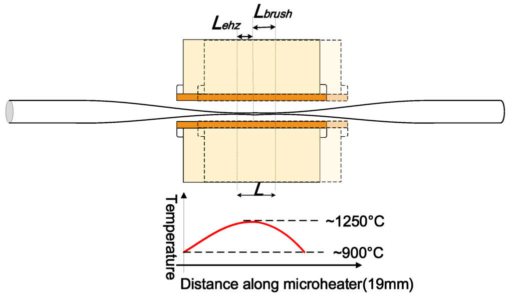 - Heating source. A ceramic microheater (CMH-7019, NTT-AT, Japan) is used to heat the optical fibre to approximately 1100~1200 °C. Silica fibres can reach a viscoelastic state around this temperature range which is suitable for tapering. The microheater is mounted on a 3-dimensional translation stage to precisely control the position of the microheater relative to the fibre. One factor that must be accounted for is that the temperature along the heat zone of the microheater is not uniform. The highest temperature occurs at the centre and gradually drops towards the edges. For instance, when the measured temperature in the centre of the microheater reaches 1250 °C, the temperature at the edges only reaches 900 °C. The temperature distribution along the heating slot of the microheater is shown in Figure 5. This quasi-Gaussian distribution of the temperature means that only a 1–2 mm heating zone at the centre of the 19 mm wide heating zone is effective for fibre tapering. This 1–2 mm long heating zone is defined as the microheater effective heat zone Lehz [7]. The length of the microfibre waist region is assumed to be equal to the length of this effective heat zone, where a simple single stretching pull of the fibre is employed. In order to fabricate microfibres with longer waist regions, the effective heating length can be extended by introducing a repeated brushing motion of the microheater into the tapering process [33]. The travel range of this repeated brushing motion is defined as microheater brushing length Lbrush. Thus, tapered microfibres with various waist lengths can be fabricated by varying the total effective heating length L = L ehz + Lbrush by controlling the microheater brushing length Lbrush. The L ehz and Lbrush parameters are illustrated in Figure 5.