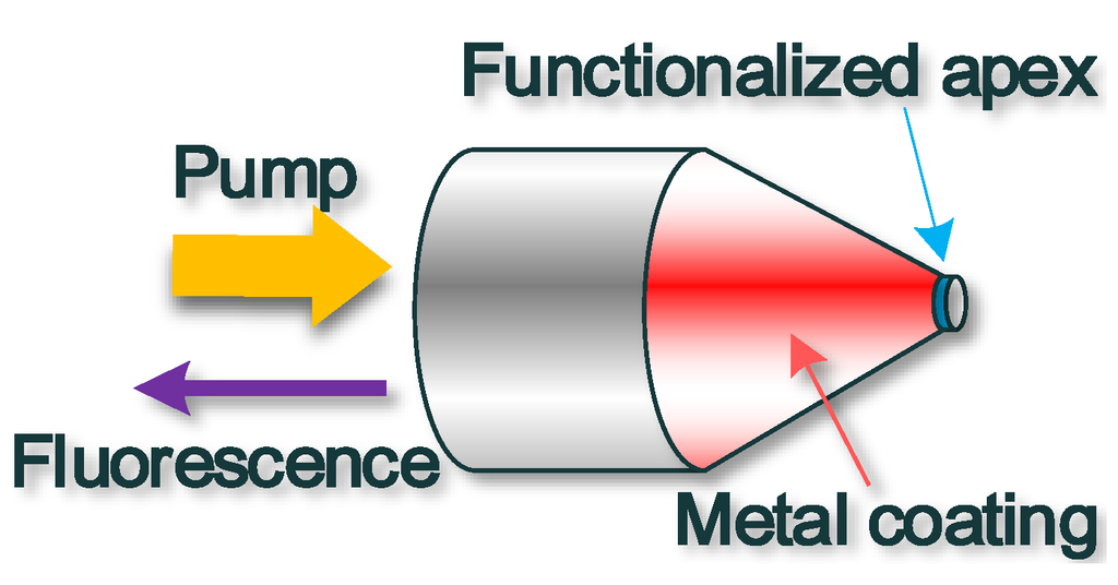Previously, microfibre tips were used for trapping micro-particles, for micro-manipulation or for coupling light in/out optical photonic integrated circuits. Recently, optical microfibres have exploited the extremely small end-face cross section (sub-200 nm) to analyse minute sensing areas, such as cell components. The advantage of using a microfibre tip as a biosensor head is the possibility of a spatial operation, especially in confined areas. In order to achieve extreme confinement, optical microfibre tip sensors were manufactured from very thin metal film coated optical microfibre tips. The end face was left uncoated (see Figure 6 below) and it underwent functionalization to facilitate covalent bonding of the targeted bio-molecule. The functionalization compound is excited using the longitudinal evanescent field generated inside the coated tip, thus only molecules in the immediate proximity of the optical microfibre apex aperture are affected by the optical field. Functionalization is generally carried out in three steps: silanization, activation and bonding of a biorecognition agent (usually antigens or antibodies with a fluorophore). The first optical microfibre employed for intracellular sensing was used to measure pH [69]. Functionalization was carried out using a chromophore (N-fluoresceinyl-acrylamide) in an acrylic copolymer. The chromophore was excited using blue light laser light and fluorescence was collected at 490, 540 and 610 nm. pH values in the range 4 to 9 were measured from the ratios between fluorescence peaks at different wavelengths (540/490 nm and 540/610 nm). The sensor response time was of the order of τ~100 ms. Biochemical compounds measured in vivo, in live cells include benzopyrene tetrol and benzo[α]pyrene [70], Caspase-9 [71], cytochrome c [72], a telomerase [73] and DNA sequences [74]. The small sensor size allows for in-situ detection of specific chemicals without visible damage to the cell. DNA specific-actin mRNA strands were detected functionalizing the apex with molecular beacons [74]; this method has been proved capable of recognizing differences in single couple of bases. Ion concentrations were measured by functionalizing the sensor apex with plasticized polymeric membranes embedding ion complexation agents and fluorescent dyes. Potassium [72] and calcium [75] concentrations were detected using valinomycin and Fura-2/AM or fluo-3/AM calcium-dyes as highly-selective ligands. Other compounds measured in live cells include oxygen [76], nitrites [77], chloride ion [77], nitric oxide [78] and glutamate [79]. At the moment, the apex size is limited by the tip transmission efficiency. For tips smaller than 50 nm, the transmissivities less than 10−6 have been recorded [80]. A way to increase the transmissivity by orders of magnitude relies on the exploitation of surface plasmons: by converting light into surface plasmons and then back into light, confinements to spot sizes smaller than 10 nm should be possible [81], with extraordinary benefits for the biosensor size.