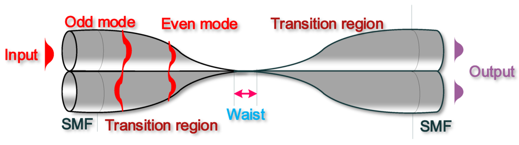 The structure of a typical OMC is shown in Figure 7 and consists of two identical microfibres with the entire waist region and part of the transition regions fused together:
