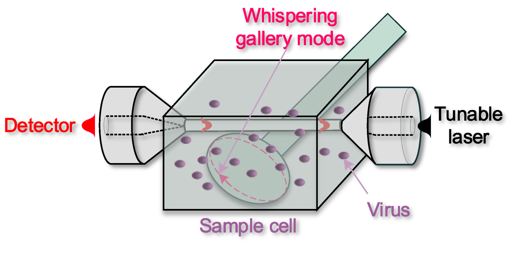 - Vollmer, F.; Arnold, S.; Keng, D. Single virus detection from the reactive shift of a whispering-gallery mode. Proc. Natl. Acad. Sci. USA 2008, 105, 20701–20704. [Google Scholar] [CrossRef] [PubMed]