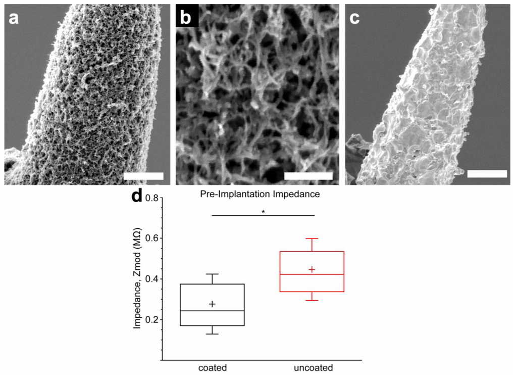 (a) SEM image of PEDOT/MWCNT/Dex-coated Pt/Ir microelectrode (scale bar = 3 µm); (b) Magnified image of (a), revealing an open, nanofibrous morphology (scale bar = 0.5 µm); (c) SEM image of uncoated Pt/Ir microelectrode (scale bar = 3 µm) shows roughness due to arc plasma fabrication method; (d) Coated electrodes have significantly lower 1 kHz impedance than uncoated electrodes before implantation, due to the increased surface area provided by the coating morphology (N = 24, box = 25%–75%, cross = mean, whiskers = SD). * p < 0.01.