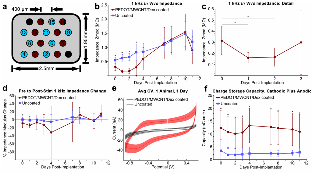 (a) FMA layout of uncoated Pt/Ir electrodes (light blue), PEDOT/MWCNT/Dex-coated (dark red), and ground and reference electrodes (black); (b) Average 1 kHz in vivo impedance, recorded before release stimulus. Significant differences were observed over the initial three days, then disappeared suggesting that the benefit either was negated (N = 24 for days 0–3, 16 for days 4–11); (c) Coated probes in (b) exhibited an impedance reduction during the initial two days in vivo, possibly due to an electrolyte permeation process through the pores of the coating (N = 24); (d) Average impedance change from release stimulus (post-stim/pre-stim). After day 1, there was no difference in post-stim impedance change; (e) Example averaged CV stimulus curve from one animal at one day post-implantation. Discontinuity indicates starting potential. A reduction peak is apparent at ~−700 mV within the coated trace, indicating reduction and dopant release. The uncoated trace exhibits no peak; (f) Average total (anodic + cathodic) charge storage capacity. Capacity of coated electrodes remained ~300% greater for the implant duration, demonstrating coating stability. For all plots, gaps at day 5, 6, and 9 are due to potentiostat malfunction that resulted in loss of data. All data presented as mean ± SD. * p < 0.01.