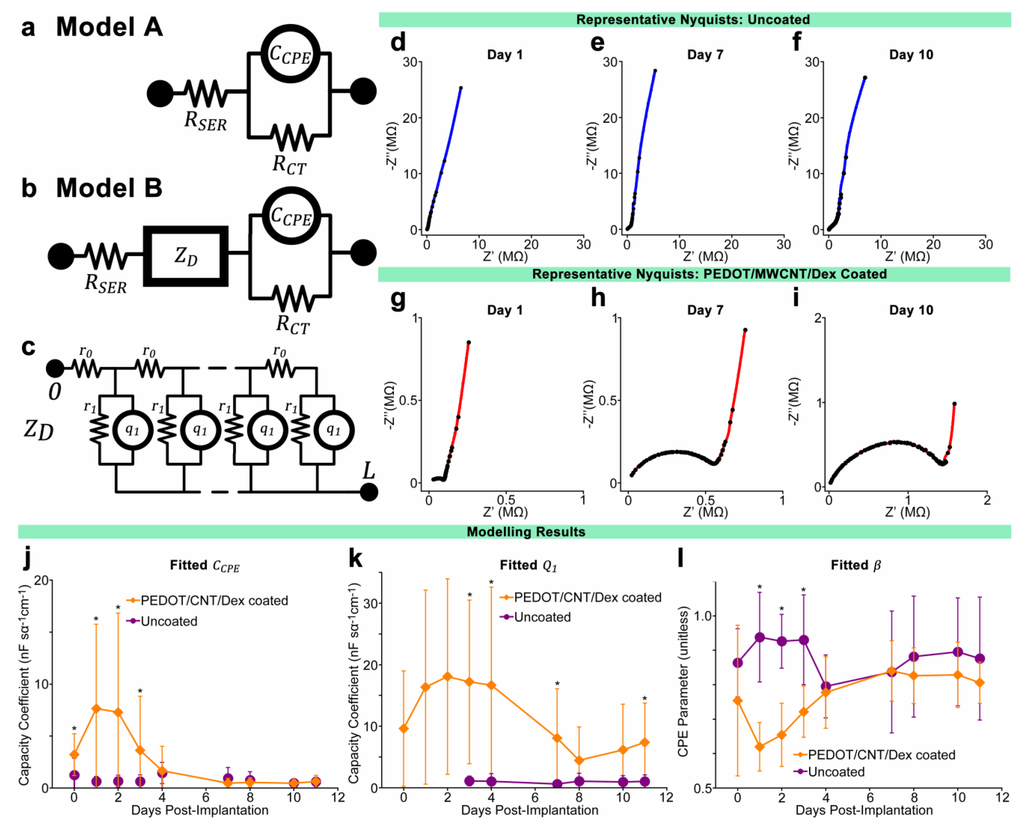 (a,b) Equivalent circuit models for uncoated electrodes in PBS or initial days post-implantation (model A) and uncoated electrodes at later days post-implantation as well as PEDOT/MWCNT/Dex-coated electrodes (model B), with distributed element ZD representing the polymer coating as well as tissue encapsulation; (c) Schematic of the dual-channel distributed diffusion impedance element ZD; (d–i) Representative Nyquist impedance plots of uncoated (d–f) and coated (g–i) electrodes at three time points post-implantation, with all plots exhibiting an identical frequency range (100 Hz to 33 kHz). Note contrast between uncoated and coated Nyquist plots at days 7 and 10 despite statistically identical 1 kHz impedance. The growing semi-circular features at higher frequencies within (g–i) suggest the development of encapsulation over coated electrodes not present in uncoated electrodes; (j–l) Average fitted values of modeling parameters CCPE, Q1, and β. Q1 were not fitted for days 0–2 for uncoated probes due to use of model A. Comparatively large values of CCPE during the initial four days indicates a coating benefit to electrode capacitance that diminished at later points. Reducing values of Q1 indicate a reduction in coating/electrolyte capacitance, possibly due to changing surface area. β exhibited low values during first four days, but later increased to values equivalent to uncoated electrodes, suggesting a change to the nature of the coating/electrode interface. N varied from session to session. All data presented as mean ± SD. * p < 0.01.