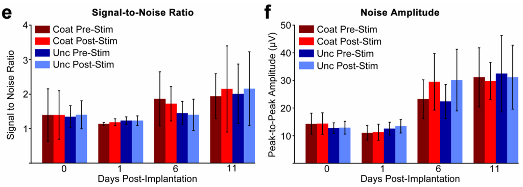 In vivo neural recording was conducted to answer the following questions (1) will the PEDOT/MWCNT coating interfere with the recording capability; (2) will the CV stimulation cause any reversible or irreversible to the activity and health of the neurons nearby. Both spontaneous and evoked neural activity was recorded before and after daily CV and impedance measurement. A variety of different drifting solid grating visual stimulation programs were employed to drive neural activity, though for the purposes of this study all measures were averaged together across spontaneous and evoked blocks. In order to provide an assessment of raw recording performance, metrics of signal-to-noise ratio and noise amplitude were quantified. In general, only sparse unit activity was observed across both coated and uncoated probes over the initial week of implantation. However, both coated and uncoated probes exhibited well-defined units. Activity in both coated and uncoated probes increased substantially within recordings taken during the final days of implantation, with recording quality being essentially equivalent. This suggests that the multicomponent organic coating did not compromise the recording capability of the electrodes. Furthermore, we observed no different in SNR and yield immediately before and after the CV stimulation, indicating the stimuli applied here are mild enough to not cause any activity change. The inconsistent probe performance from day to day during the initial week post-implantation is likely due to the progression of acute inflammation and edema local to the implanted electrodes and the eventual stabilization of the interface tissue as it enters the chronic inflammatory stage, and is a rationale behind the common practice of delaying neural recording for the initial week post-implantation.