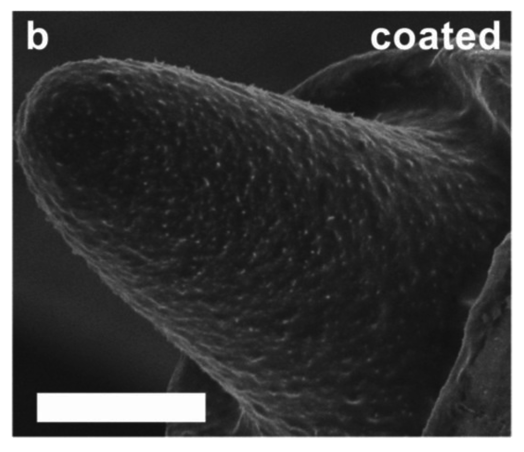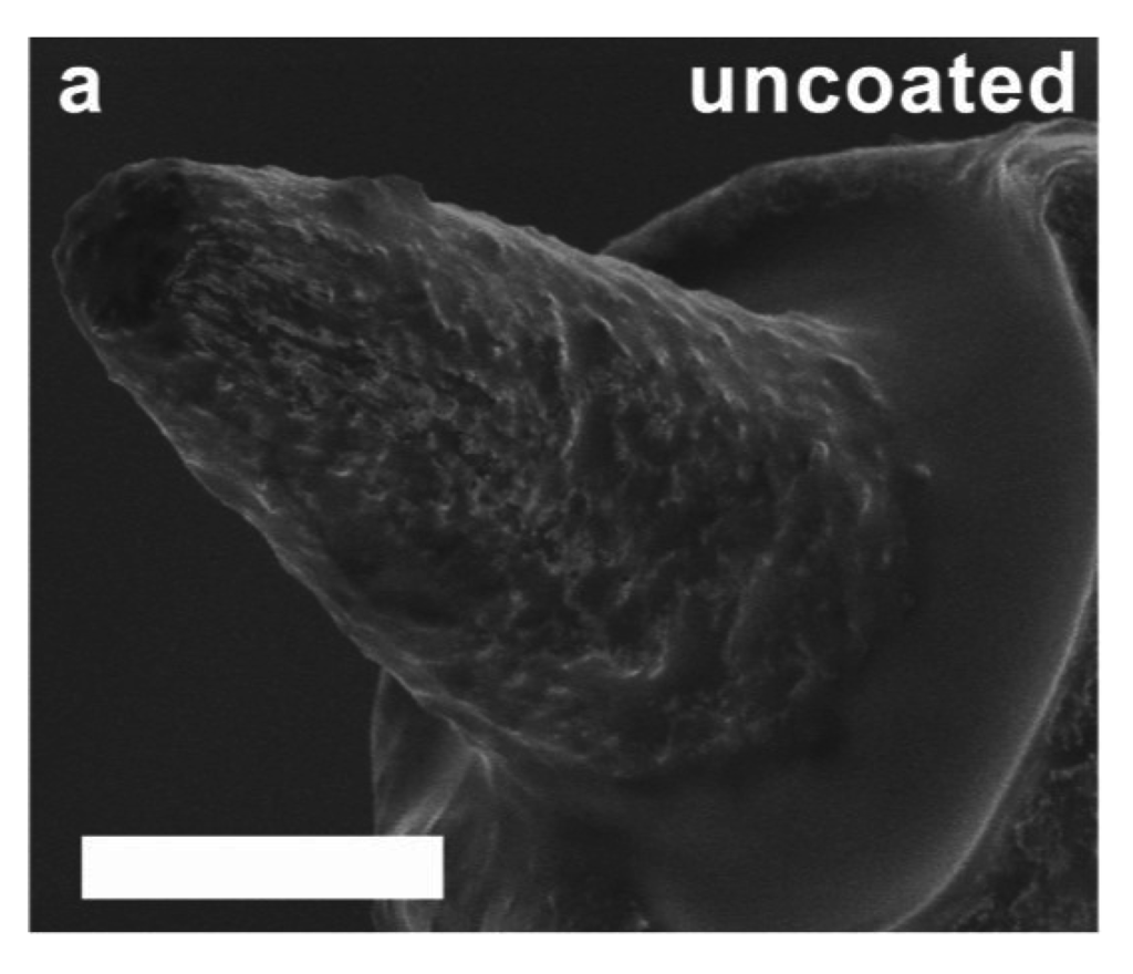 SEM images of representative uncoated (a) and PEDOT/MWCNT/Dex coated (b) electrode tips extracted from the brain after 11 days. Tips were cleaned using trypsinization and dried before imaging. Note intact coating with no visible cracks or spallation, and the presence of a dense biological film overlaying the coating. Scale bars = 3 µm.