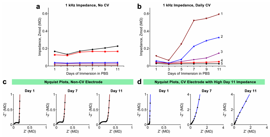 (a,b) 1 kHz impedances of individual PEDOT/MWCNT/Dex-coated electrodes chronically submerged in sterile PBS over 11 days. Electrodes in (a) were not subjected to daily CV, while those in (b) were subjected to daily CV. Electrodes in (b) are numerically labeled for reference; (c,d) Representative Nyquist plots collected at days 1, 7, and 11 for a non-CV-stimulated electrode (c) and a CV-stimulated electrode that exhibited high day-11 impedance ((d), Electrode 2). Note that non-CV-stimulated electrodes exhibited characteristic high-frequency behavior at all days, while high-impedance CV-stimulated electrodes exhibited a progressive “straightening” and loss of characteristic high-frequency behavior.